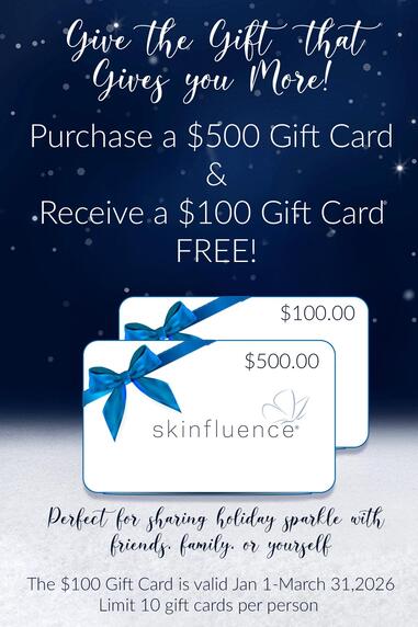 Purchase a $500 Skinfluence Gift Card and receive a $100 Bonus Gift Card—our gift to you. The bonus card can be kept for yourself or sent to someone special. It’s the perfect way to experience Skinfluence’s signature aesthetic artistry or share it with a friend or family member.